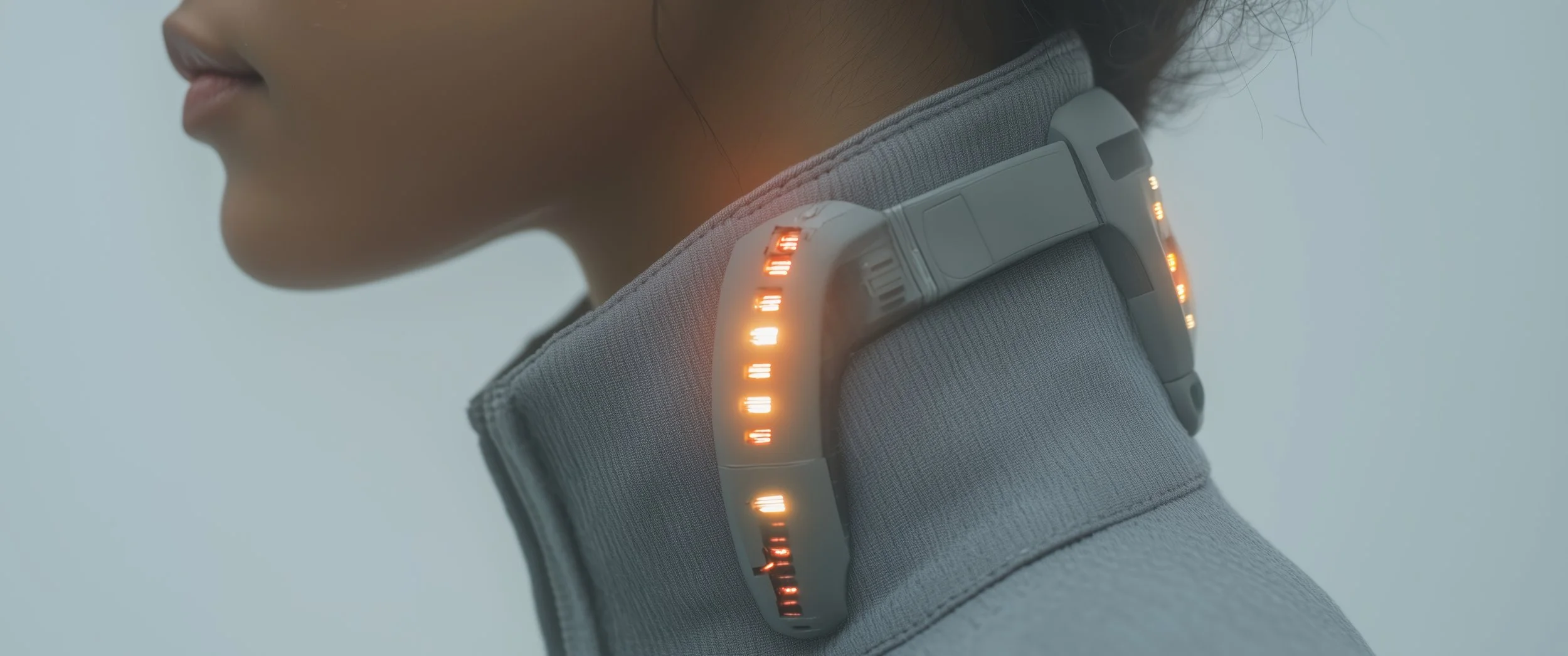 The imagery centers on wearable cybernetic devices: luminous neck braces and spinal modules integrated seamlessly into the human body. Cold textiles in muted gray and beige tones contrast with the warm glow of orange and red LEDs. The focus on details—microcircuits, light indicators, synthetic textures—creates an impression of precision, restraint, and inevitability. The shots deliberately avoid full facial views, emphasizing the apparatus rather than individuality, as if identity itself is being rerouted into the circuitry. Mist and soft diffused light dissolve the environment, directing all attention toward the mechanical implants that pulse like artificial arteries of a new life system.