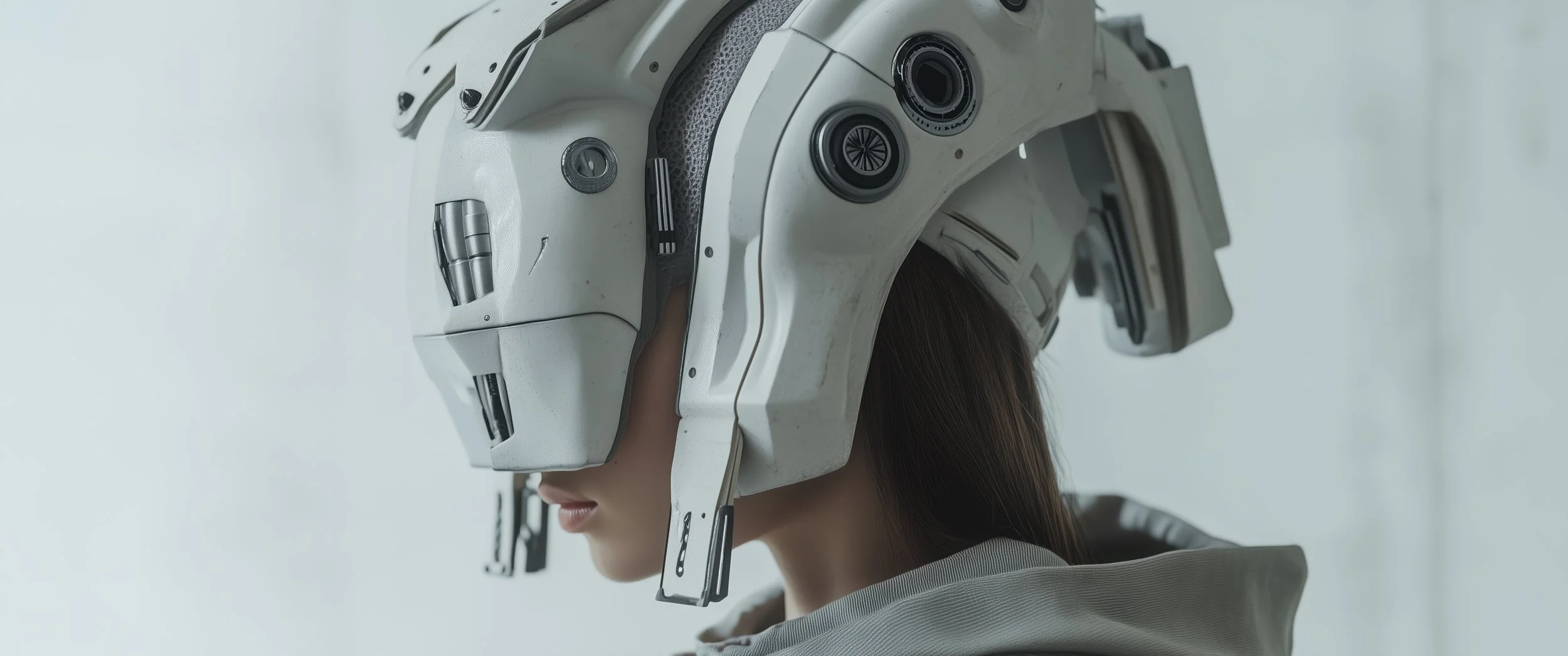 The close-up framing emphasizes the delicacy of skin contrasted with the mechanical headset. Glowing neural lines extend from the device across the cheek, resembling constellations or branching synapses, visually suggesting a direct link between machine and consciousness. Soft lighting enhances the fragility of the human face, while the sterile background isolates the figure, intensifying the sense of clinical experimentation. The hair color, pale and synthetic, harmonizes with the cool palette of the device, reinforcing the blending of human intimacy with technological artifice.