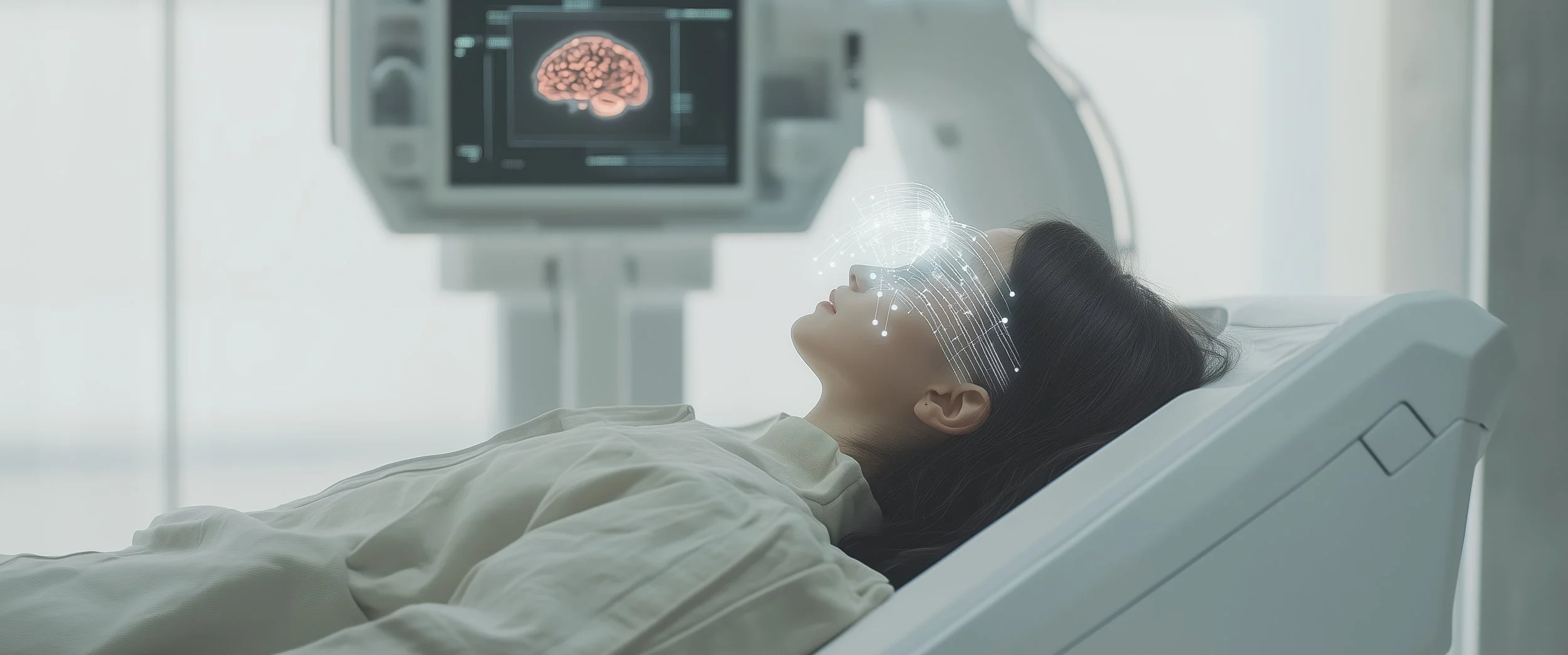 The visual design here focuses on the sterile minimalism of medical futurism: white clinical interiors, luminous interface overlays, and precise geometric projections mapped across the subject’s face. The light-traced neural grids, hovering above closed eyelids, merge seamlessly with the body’s natural contours, suggesting a fusion between medical imaging and digital cartography. The machines are understated yet monumental, presented as cold architectural presences rather than tools of care.