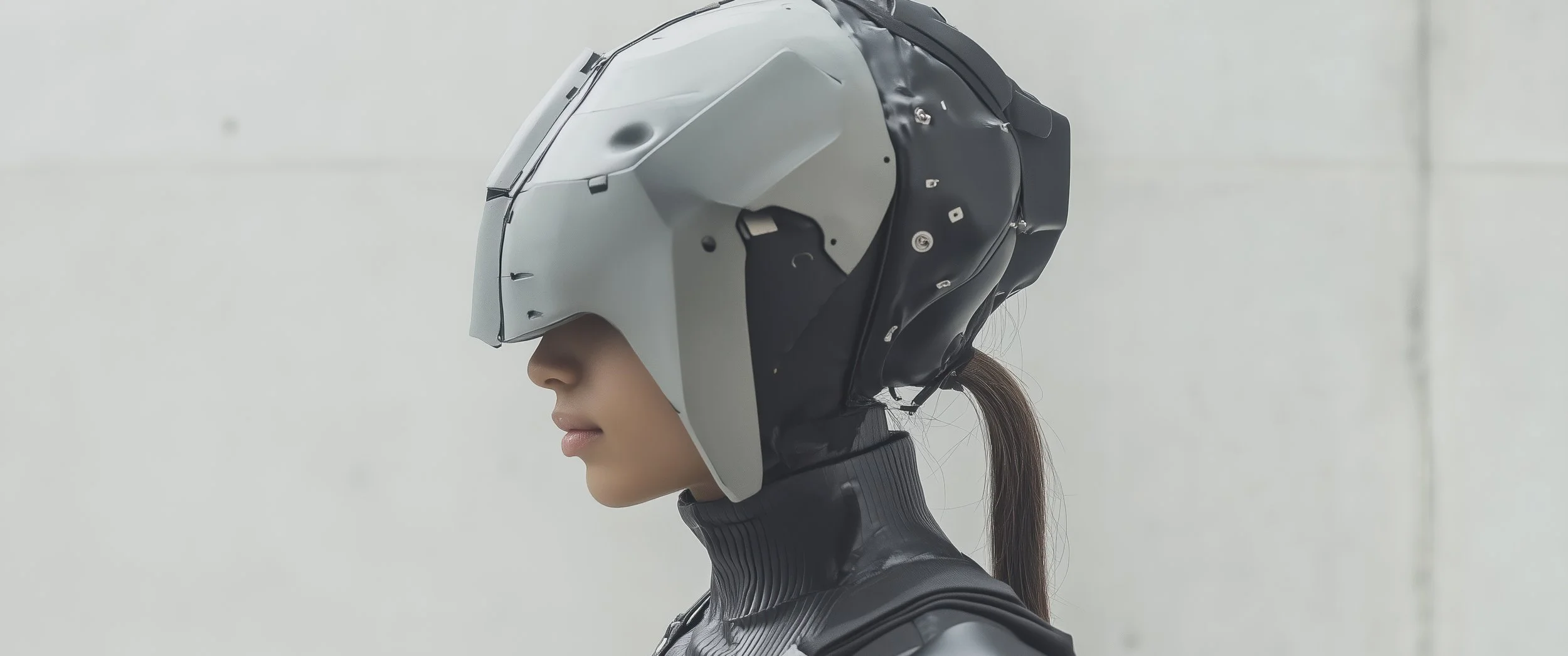 The sequence showcases a series of futuristic helmets—massive, metallic, and clinical, blending medical precision with military aesthetics. The camera emphasizes side profiles and close-ups, stripping individuality and focusing instead on the engineered shells encasing the head. Surfaces are sterile white and matte black, punctuated by screws, vents, and glass visors. Subtle reflections of neon lines or environmental lights accentuate the rigidity of form. The helmets create a stark separation between the wearer and the surrounding world, rendering faces inaccessible, hidden behind layers of synthetic material. Each shot is carefully composed to highlight both scale and detail, transforming the helmets into symbols of technological dominance over perception.